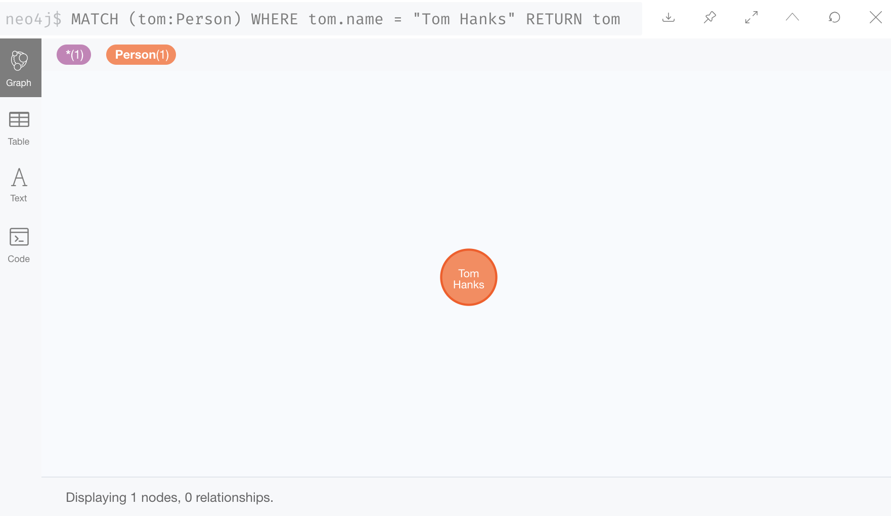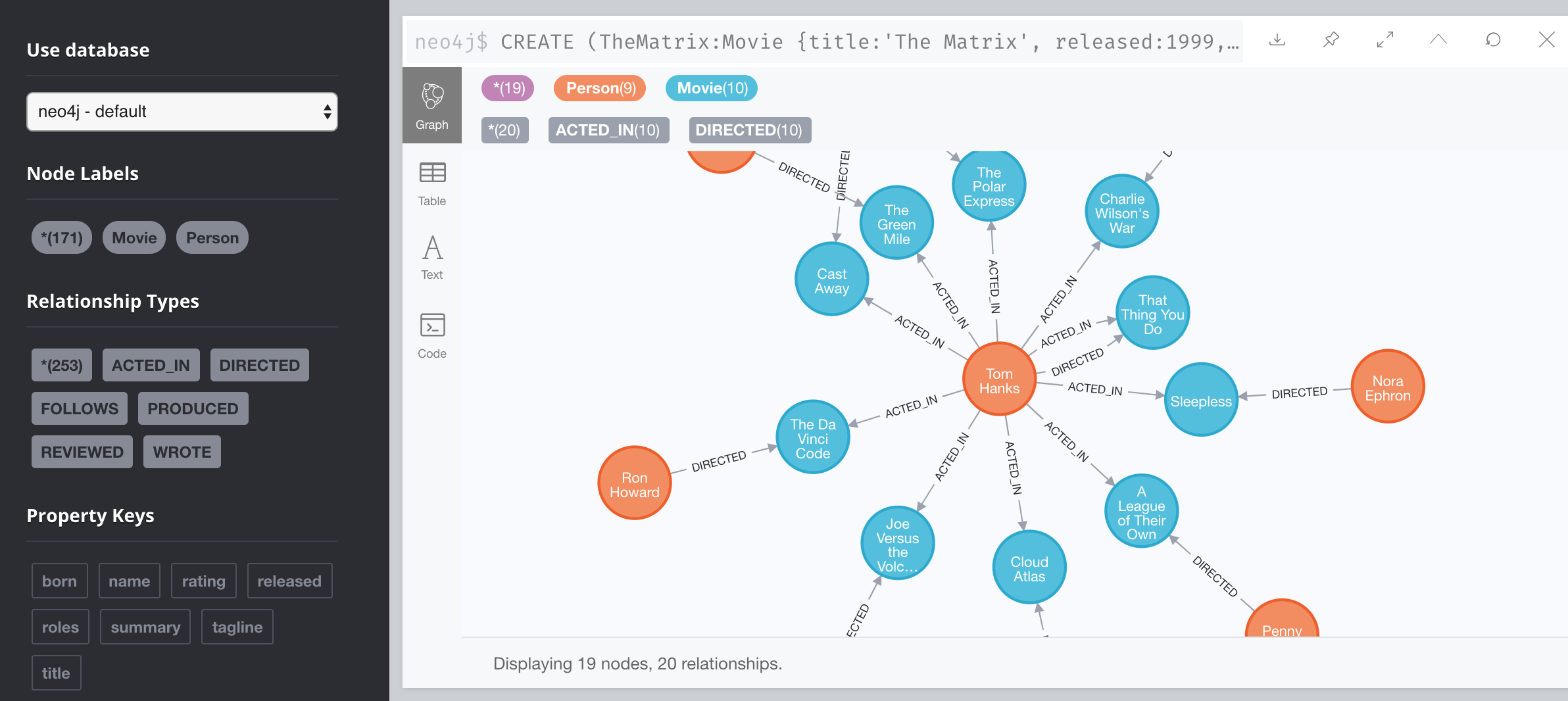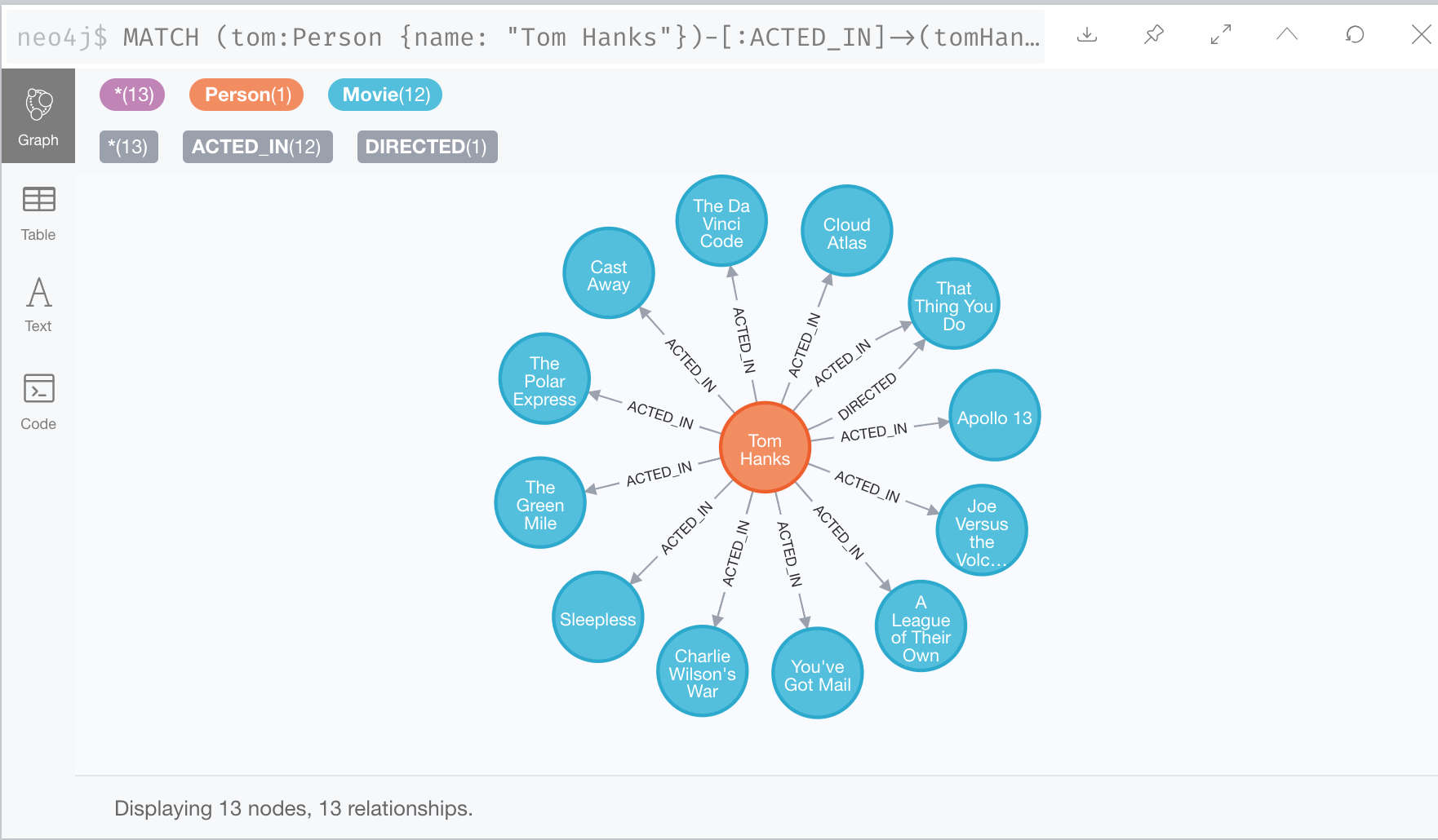 请注意,在这里我们还看到了汤姆·汉克斯节点和 Movie 节点之间的 DIRECTED 关系。这是因为我们的 Neo4j Browser 中有一个设置,使得结果节点将被连接