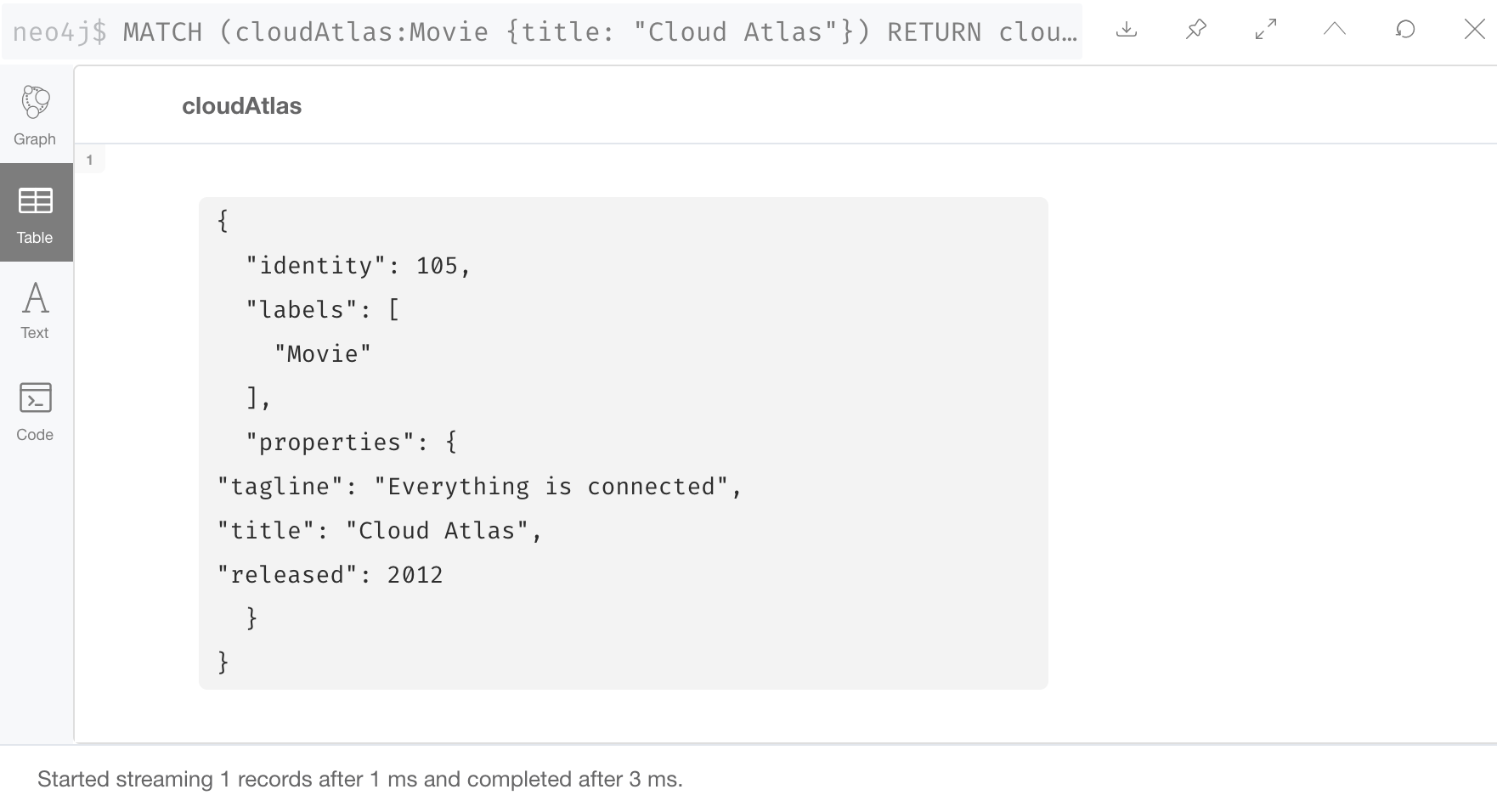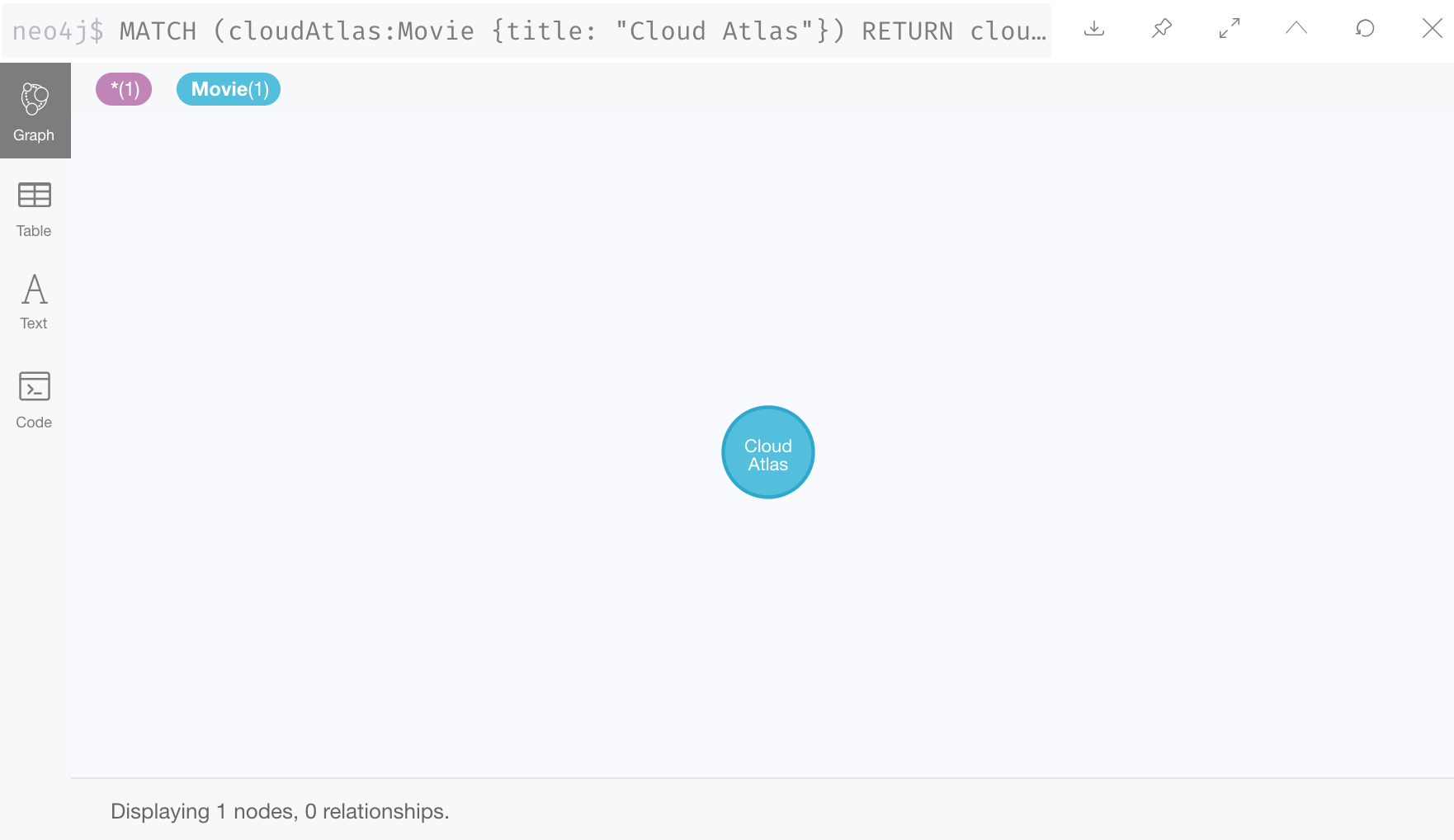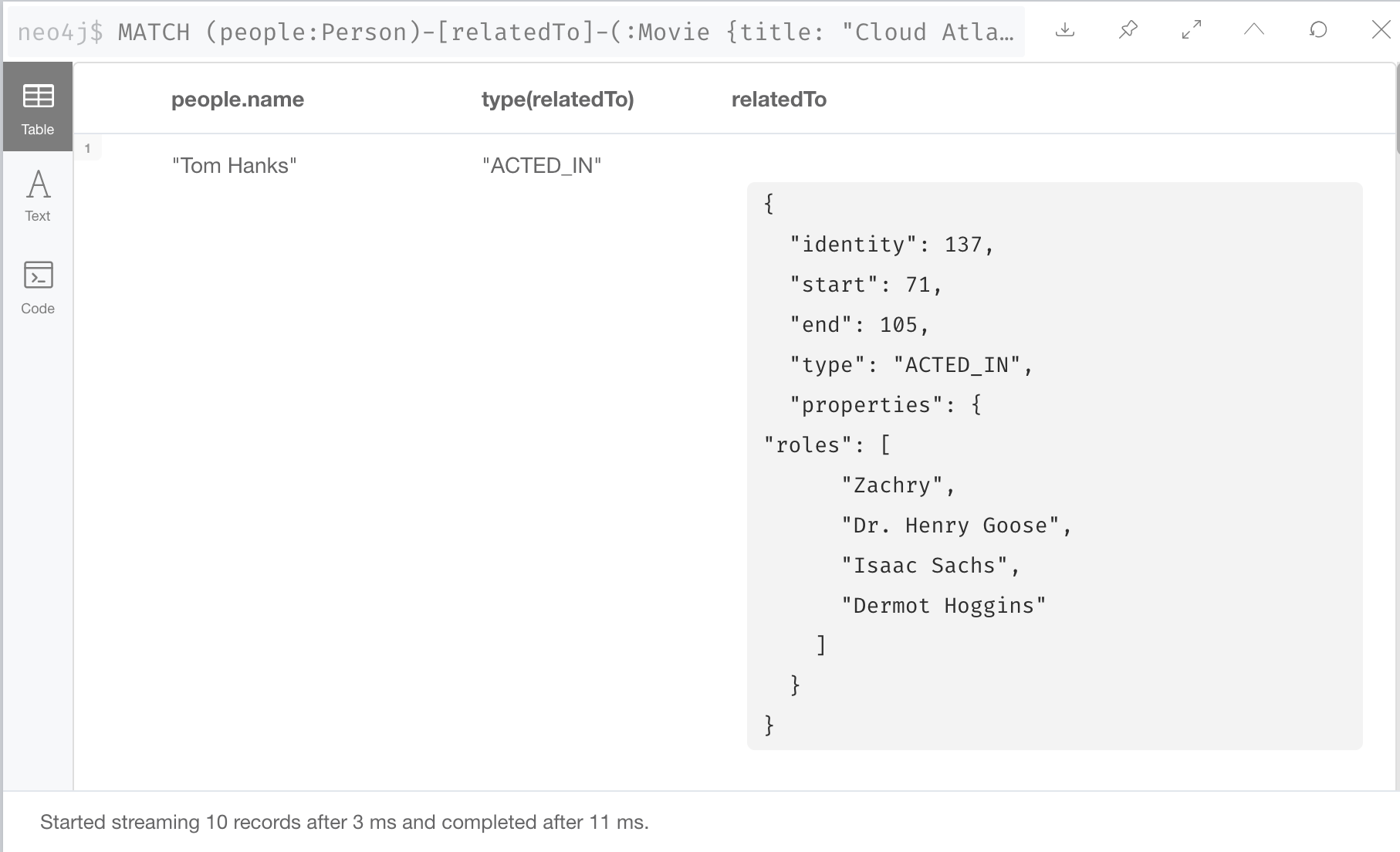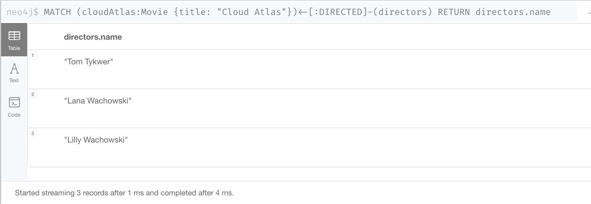 这是一个查询,我们想返回与《云图》 Movie 节点有 DIRECTED 关系的节点。它将返回执导该电影的人员姓名。