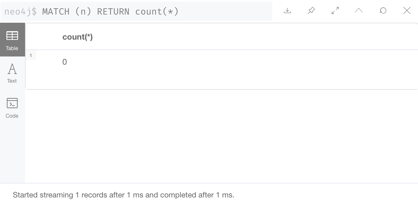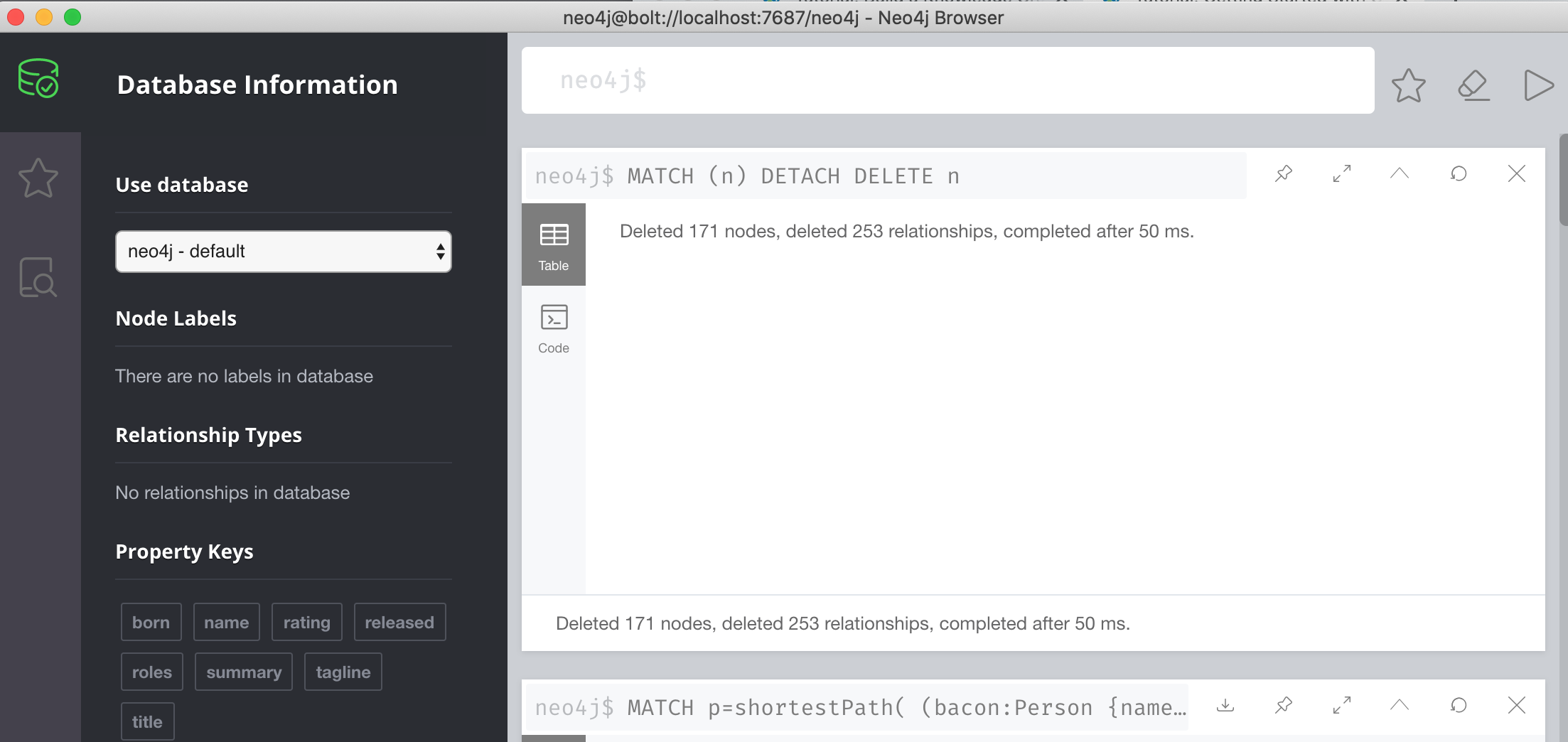 当您在查询面板中运行 Cypher 代码时,它总是在查询面板下方创建一个新的结果面板。 |