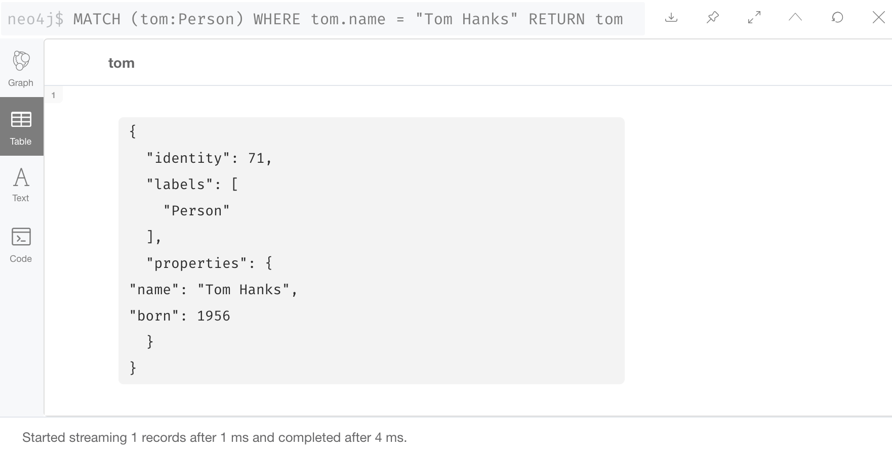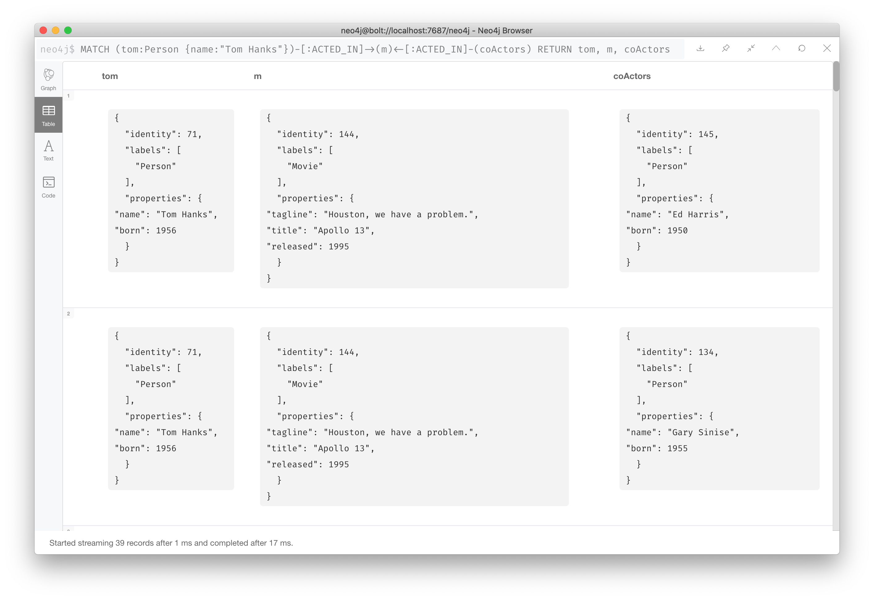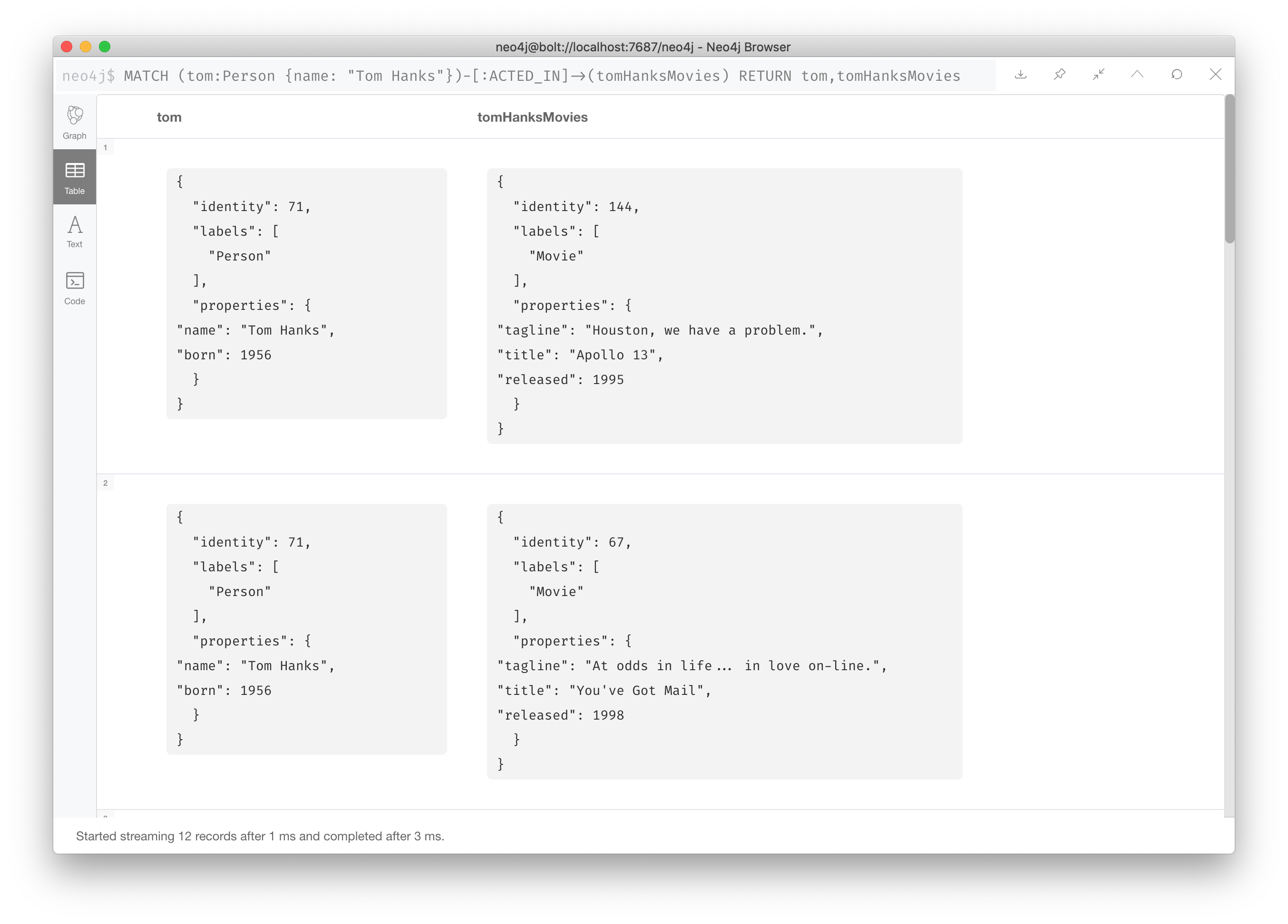 这是一个查询,我们想返回演员汤姆·汉克斯的 Person 节点,同时我们还想返回所有与汤姆·汉克斯有 ACTED_IN 关系的 Movie 节点。也就是说,汤姆·汉克斯出演过的所有电影。
