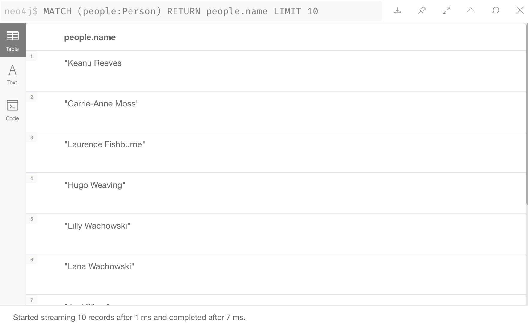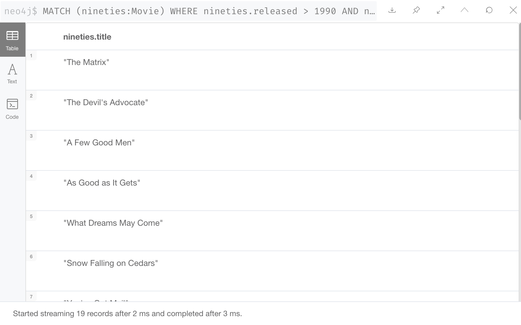 您查看结果的方式也取决于返回的数据。如果查询返回节点,则可以将数据视为图。如果查询返回属性值,则只能将数据视为表格。